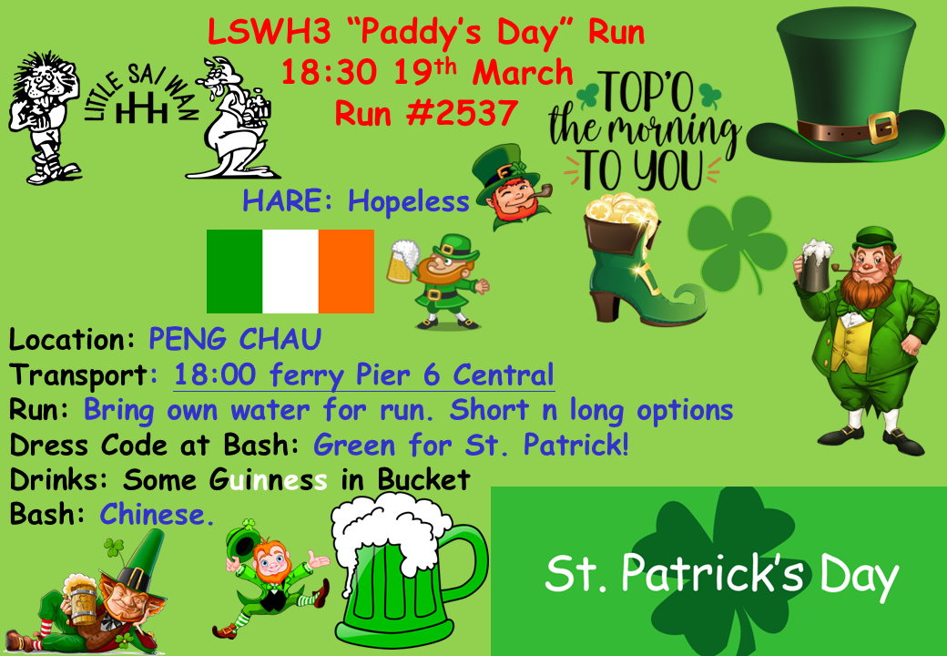 St Patrick's Day, Peng Chau Hare - Hopeless Hashers - Chris P, Lost In Space, Dean C, Gobi Lo, Indyanus, Back to the Future, Shake My Shack, Lindsay E, Hopeless, Mike C, Clean My Bush, Ivana Nucock, HellBoy, Freebie, Any Fanny'll Do, Cute Boar Butt Write-up - Lost in Space Celebrating post St. Patricks Day in true style LSW was off for a twilight “Paddy’s Day” run on the exotic Peng Chau island hared by our ever prolific hare Hopeless. With an early kind of far away hash it would seem to make for a small pack but I was rather impressed with the turn out. We had pleasant mix of oldies, newbies and visitors followed by a couple of late comers. So off we left form the pagoda for our trek around the island. I was able to chat with some hashers for the first few minutes before they breezed off and I had the whole island to myself. Along the waterfront , through some villages and into the interior we went as dusk turned to evening. We ran the island counter clockwise. After good conversation at the pagoda it was off for our Irish ugh Chinese dinner where drama began when head torches went missing and the investigation was begun. As I made an early diversion on a secret lesser traveled Discovery Bay ferry I am unable to report on how the investigation reached its conclusion. But I anxiously await Indy’s DD notes to learn who the culprit was. Thanks to the hare for a great run and everyone who came out early to make this a successful and enjoyable Paddy’s Day celebration!! DOWN DOWN’s by Indy - faithfully scribed by Any Fanny’ll Do! 🙏 The hare - Hopeless… welcome to St Paddy’s Day ☘️ run!! Any Irish here?? Hopeless… really fun and interesting trail!!…. All deemed the run to be ‘no less than awesome’… Hopeless - setting trail on Peng Chau.. the first LSW hash there for 8 years… 🤩 Hopeless - previous hare had been our much-beloved legendary Sweaty Snail Gobbler.. all raise drinks in fond remembrance… 🍸 Any Fanny’ll Do / Clean My Bush - late comers as missed the 6pm ferry…. AFWD - was cursing the hare for earlier run start at 6.30 pm.. spent time on ferry checking if LSW had rules and clauses about the start time.. 🥸😩 Clean My Bush - great trail..found hell $ on every grave visiting all of them (though usually likes to keep his distance from them..) Virgins - Chris / Mika / Dean.. welcome!! Returnee - Hell Boy Findlay - welcome back! #2 hash … has 💯 % attendance - Findlay - ‘awesome’ trail ! Really enjoyed it… Chris - superfun trail! Initially confused about going to the ‘hash’ as thought he was going with Gobi Lo for ‘a smoke’ 😂 Mika - Gobi Lo’s 12 year old niece visiting from S’pore… impressive! 👌Kept up with GL the whole way and running up hills ahead of Shake My Shack !! Hopeless - putting trail arrow in front of a wall (albeit ‘tits’ high) to confuse hashers… over they went into shiggy except yours truly who checked the circuit and found a ‘sensible path’… Hell Boy - on tiny shiggy steps down trail he had to get his 4th leg out..😂 Freebie - thought she had lost her torch saying SMS’s may be hers??.. she eventually found hers in her ‘secret place’ at the bottom of her bag…🤭 Hopeless - had left bash earlier to get re supplies of Green Carlsberg for ferry ⛴️ trip back to the bigger island of HK… Hopeless 2.0 - had indicated earlier he only wanted to drink the Blue Carlsberg 0’s 🥶after a real pint at the Old China hand… Shake My Shack - the reinvented Hopeless 2.0.. Hopeless 1.0 - ‘like a female’ 💋I changed my mind after 1 Blue Carlsberg 0.. think I will have a green one ☘️ after trail setting… Hell Boy - says drinking beer 0 is ‘like having sex in a canoe.. it’s like drinking water 🥶’ Gobi Lo - entered the 250 km Gobi Desert Race in which she finished 1st female..🏆yeh!!! as a Singaporean.. but has a HK passport?? Her reply..am a ‘gun for hire!’…😎 Chris / GL / Mika - came straight to hash after rock climbing at back of Mid-Levels 💪💪💪 Chris - will be coming back to the hash - going for 💯 % attendance 👌 Hopeless stats Shake My Shack - Looking forward to your 200th hare run!! Findlay - you can give up your day / night job so you can get to over 1200 LSW runs… 💪 All those not wearing green - AFWD / Findlay Hopeless - thanks for a really awesome St Paddy’s Day run / bash and ferry ⛴️ trip!! And the most popular hash #️⃣ song 🎵 was sung by Hopeless for the 1205th time…
