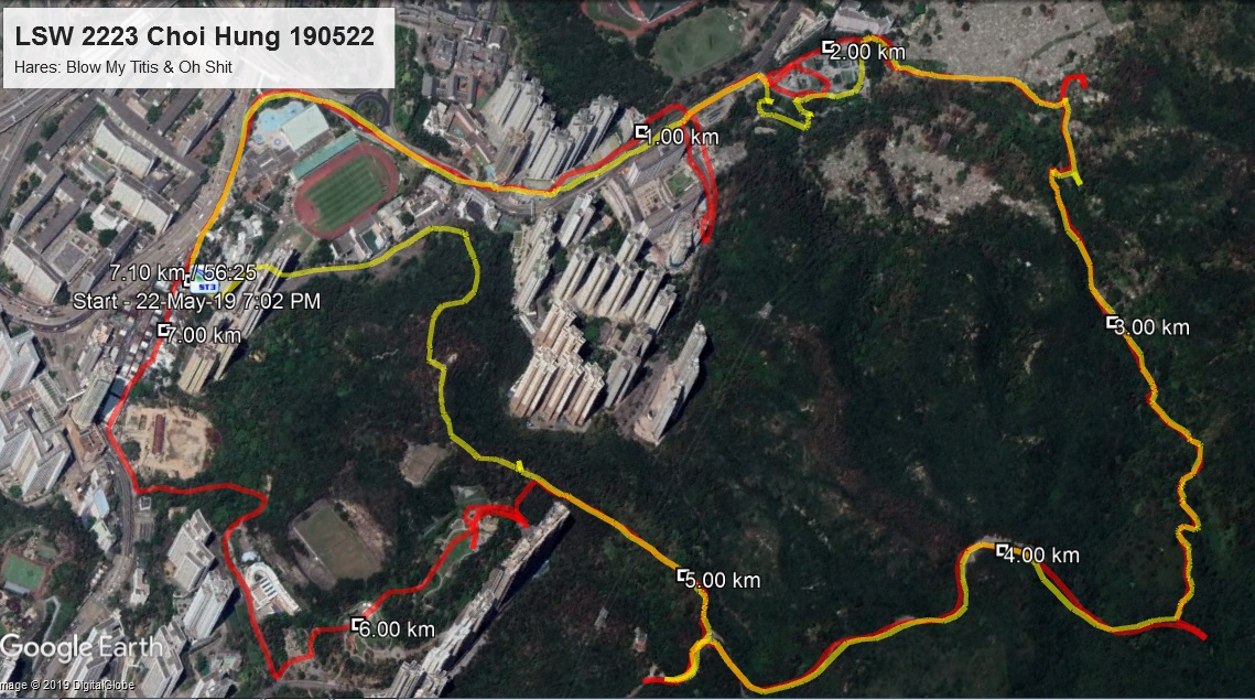 LSW 2223 Choi Hung Hares - Blow My Tits and Oh Sh1t Centre of attention before the hash got underway was Cheesy Flying Fox. Or, rather, CFF’s “Out to the main road and turn right,” the hares directed. CFF and I did as asked. The rest of the pack shortcut having followed Burning Lust who was determined to stay ahead of CFF and didn’t see his chances as particularly increased by CFF weighting himself down. BL did a good job of solving the early checks up Hammer Hill Road, but this had the side effect of sending me, Hannah Montana and CFF the wrong way and with even more work to catch up. Nevermind, the hares had a sneaky check at Diamond Hill Crematorium. Despite it being a closed check, there were no arrows indicating possible direction or end of trail markings to be found. After running hither and yon, or milling around at the check asking “are you”, according to the preference of the hashers, HM discovered true trail up a side road leading behind the crematorium. A little twisting and turning around the paths through the grave yard brought us to some slippery green paths. The pack decided it would be much safer to walk up these than try running. Finally, we left the path to enter the “short shiggy section”. The pack was led by Hopeless, who had all along known which way we were going as one hare had let slip the trail went through the bamboo forest, possibly during a rant about how deceived he had been by BMT. This suited me as it meant Hopeless could clear the spiderwebs. Just for extra protection I sent BL ahead of me as well. Now, Hopeless has a great sense of direction and has been hashing for so long he has a pretty extensive knowledge of trails all over Hong Kong. Indy, despite hashing for at least as long, does not. Somewhere towards the rear of the pack, Indy found a circle with a cross in it. Those listening to the briefing knew that meant end of trail. Indy had not listened. Wondering what the marking indicated, she totally ignored it. And totally ignored the next one too. And then wondered why someone had covered over trail markings with leaves (the hares later ’fessed up to doing this having themselves gone the wrong way). And Indy persisted in going the wrong way. Thankfully she stumbled back onto true trail and got back to A just as discussion was turning serious about sending out a search party. Back to the main pack, we had reached the bamboo climb. The leaves made for a slippery climb up. Hopeless by this point had got fed up clearing the cobwebs and HM was now in the lead. Yes, I do usually shoot up anything vertical, but I hate getting entangled in spiderwebs and prefer a slower ascent to actually doing any of the clearing. Finally we reached Jat’s Incline and a chance to stretch our legs. Screwtop was particularly happy about this. Visitor Disappearing Hare Line was less impressed as he was hoping for a bit of a flat run before heading downhill. Down a hill on tarmac, no roots, no rocks, no steps – best thing ever as far as I’m concerned. Unfortunately we had to leave the tarmac for the steps, though Burning Lust and Hopeless both hoped otherwise, going the wrong way at the check. Towards the bottom was the Wimp/Rambo split. That was when the fun and games started. The Rambo trail totally disappeared when we reached the bottom of the steps. BL finally made out a faint circle that might once have been a check. The park looked the most promising direction so off we went. BL, Screwtop, Jonathan and HM soon started to feel we had gone too far without seeing anything. Remembering this park from a previous Brother @nus run, I knew there was a strong possibility that the chalk had been meticulously cleared. Finally, CFF and I discovered a lone chalk arrow on the steps. Calling back to the pack, my voice reverberated around the buildings meaning the others were not able to get a clear direction. BL finally figured out which way I’d gone as CFF and I continued calling as we found stray arrows. Now it was easy to find trail. All you had to do was follow the irate Chinese lady who was swearing at BL for desecrating her park with chalk. A right turn after the park took us along Ping Ting Road East to where a load of lorries had parked. There the trail turned left, which caught some hashers by surprise as they went tearing past totally ignoring the hare’s markings. A little more shiggy on some very unstable rubbish brought us down to Clearwater Bay Road which we zoomed down before battling our way past waiters and customers through the dai pai dong area to take us back to A. Rambo trail: 6.5km, 325m elevation. Down downs … [Apologies for any I missed, I may have dozed off in the middle …] Hannah Montana was designated Beer Bitch for the evening, many wondered loudly if this was wise – would HM drink all the beer before it made it into dd cups?! Making use of this distraction, Sticky and Crackpot make their getaway, Crackpot desperately downing her beer as SST dragged her out of the door. And finally, Indy’s ready! No, let’s sort out dog bones first!! We finally begin … HM for the size of dds – surprisingly small as he tries to keep as much beer back for himself Run 2223 – to the hares – not enough shiggy, more bamboo, not slippery enough! Vote by thumb as in Ancient Rome – most go up, even Mother Theresa was happy (but not so Lost in Space and Indy) Mother T asked to be honest, how really feel? Caved in as she likes the hares, so a good run Indy on time as love Oh Sh1t’s runs – these generally mean going to 7eleven for a beer and then back careful not to break a sweat – what a traitor tonight, Indy prefers his 7eleven run Oh Sh1t short cut a 3km family day run, that is what Indy was expecting today Blow My Tits – as it was her trail and she set the majority of it, Oh Sh1t only set wimps alone To BMT – confusion over word “technical”: to Indy this means rocks/water, but for this trail more expletives required Wimps: Bro