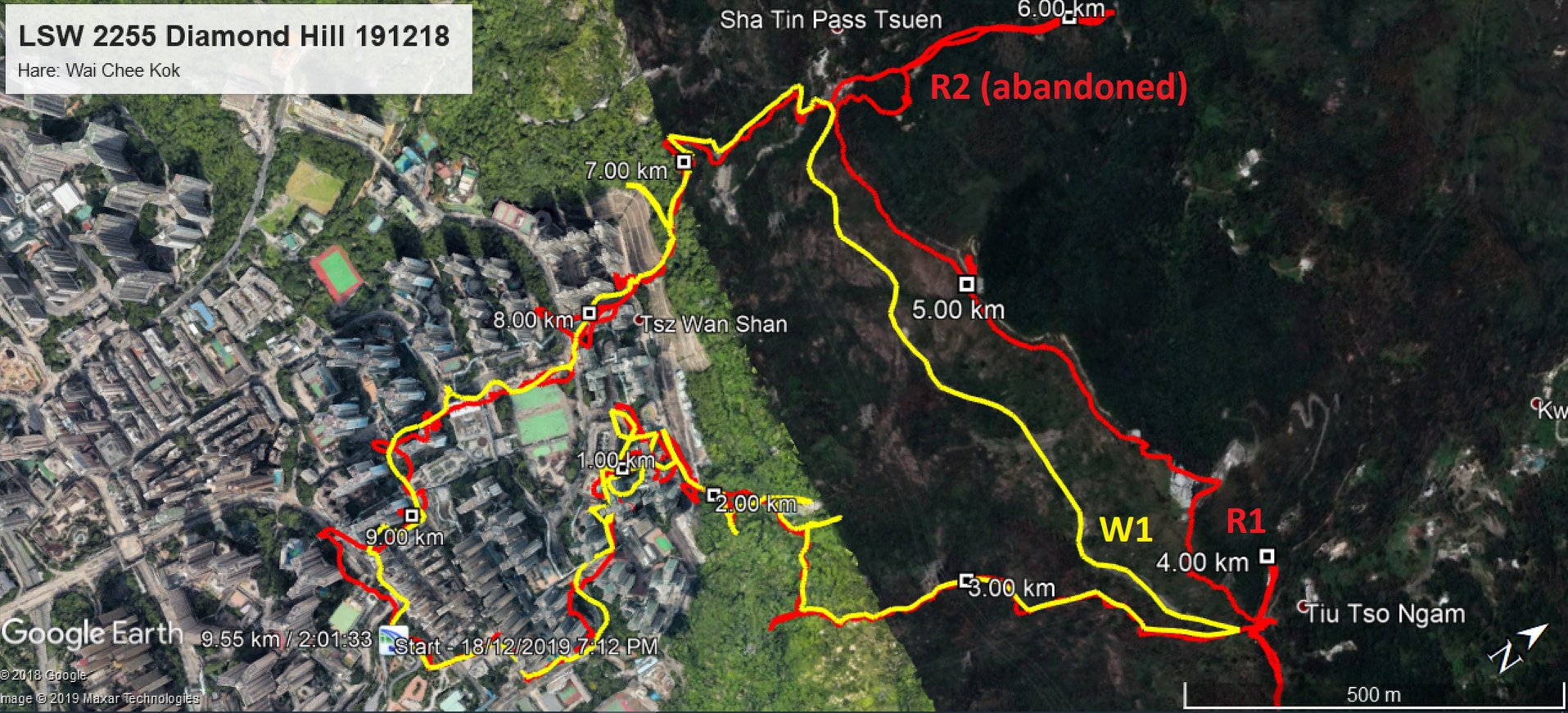 Diamond Hill Hare - Wai-chee Write-up - Bobbledick Hopeless & Kannot Finnish FB photos The peeps - Bobbledick, Octopussy, Tight Lips, Brother Anus, Marcel No Name, Hopeless, Kannot Finish, Ivana Nucock Were most LSW hashers already on their way out of HKG for Christmas or did thay all have an idea what this run from Wai Chi would entail. After all, Diamond Hill, the closest MTR station is at the foot of Kowloon Peak. And if one is lookking for Shiggy trails, which is what LSW is all about, then there is only one way to go and that is up ..... Kowloon Peak. Furthermore, the walk in to the START of some 10mins gradually upwards to the Po Kong Village elevated cycle track, took us ever nearer the mountain. Fortunately for most, the start time was put back to 7:10pm. But this scribe still arrived some 10mins late. This due to his thinking it quicker to take one bus directly to Diamond Hill. But after not knowing which end of the MTR was which, he managed to sort himself out and about 15mins later found a lonely hare and just 6 bags on arrival under the elevated cycle track. 5 regular hashers and 2 newish runners had already set out. After a quick briefing, I set out not knowing which of the W1, W2, R1 or R2 running options to take. Fortunately, my mind was distracted by noticing that I had company......in the form of an even later Octopussy. We wended our way together out of the park, up the road and then through a series of housing blocks , these with many flights of concrete steps and across paved platforms where the trail was somewhat difficult to follow due to being worn by the many commuters arrivng home. Finally, it was out on to shiggy and up, up and up, fortunately on many rough concrete steps and easy to follow all the way to Shatin Pass Rd. Here, Octopussy courageously set off right to find the W2 option, while BobbleDick decided to stick with W1. By keeping to the shortest route he hoped to catch up with the front runners at some point and avoid being accused of delaying the social side of the evening. However, he wasn't alone for long before Octo rejoined, having failed again to find trail, now two weeks running! It was down Shatin Pass road to the much loved dai pai dong, used frequently during Trailwalker training in the old days. These two worked in tandem to find their way back and home for 9pm, having been out for about 90mins. However, the bad news was that Brother Anus and Marcel were still out! The two were tracked on Hopeless' very smart phone and the decision was made when they got close about one hour later, to have the DDs at the bucket.